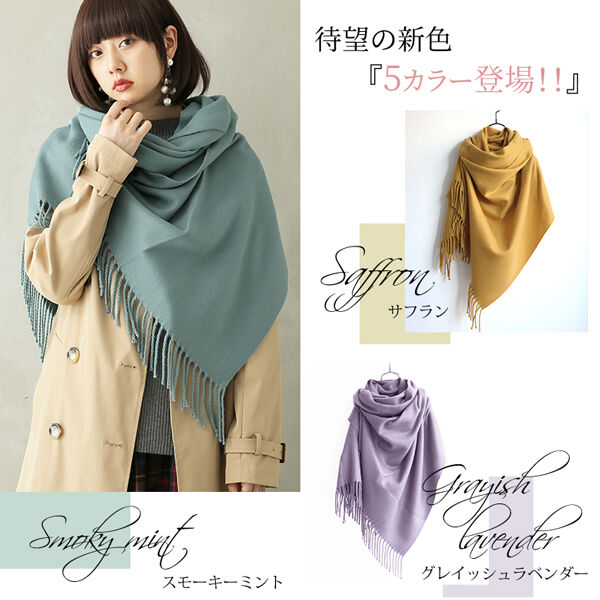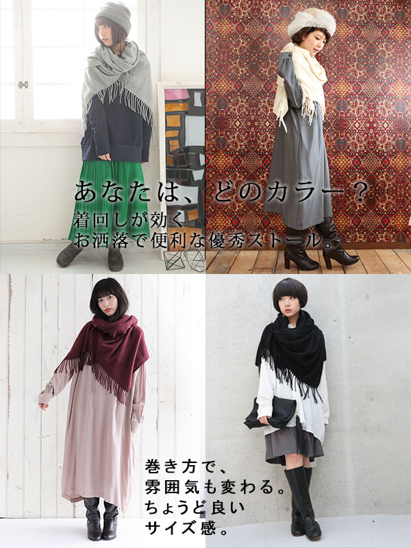 差し色だけでもこんなにお洒落になれる『シンプル大判フリンジストール』です。